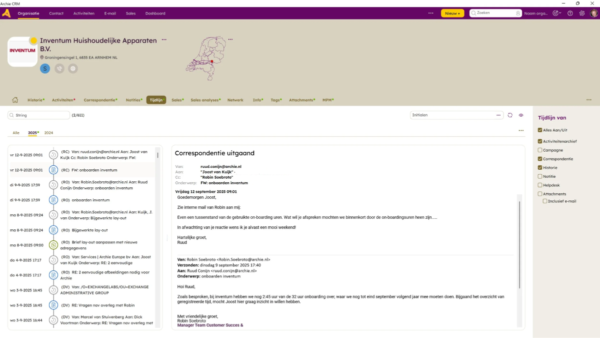 De tijdlijn-functie van Archie CRM maakt per jaar in een overzicht inzichtelijk wat er bij een relatie is gebeurd. Daarbij kun je ook filteren op bepaalde type gebeurtenissen zoals: e-mail correspondentie, bestanden, facturen, campagnes en telefoongesprekken. Op die manier heeft iedereen direct zicht op de laatste stand van zaken bij een relatie.